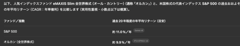 手数料が低くなるのは非常に重要なんだけど、オルカンとS&P500のリターンって・・・どれぐらい違うんやっけ。と。