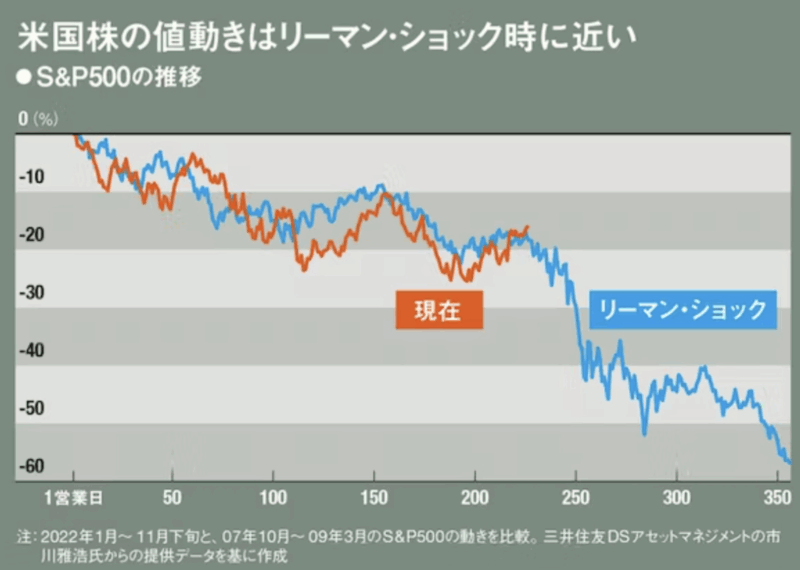 例えばこれです。 意味不明の頭おかしい記事なんですがどういう内容かというと、2022年12月の直前の2022年11月までの株価と、2008年の大暴落を引き起こしたリーマンショックとの比較をしてみました!みんなやばいよ!早く売っとけ!っていう記事です。