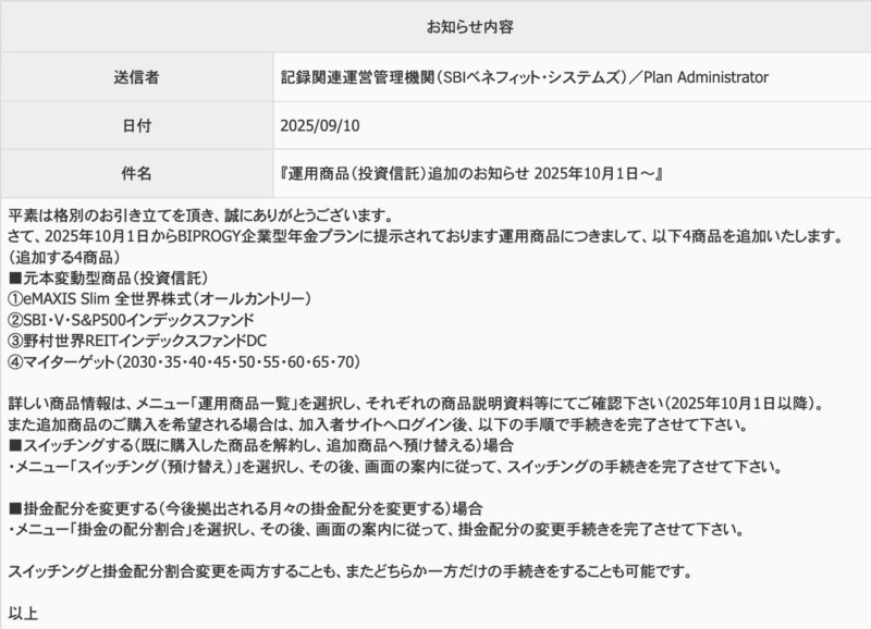 というわけで仕方がなかったのですが、ふとSBI確定拠出年金のページに、運用商品追加のお知らせがアップされていることに気がつきました。